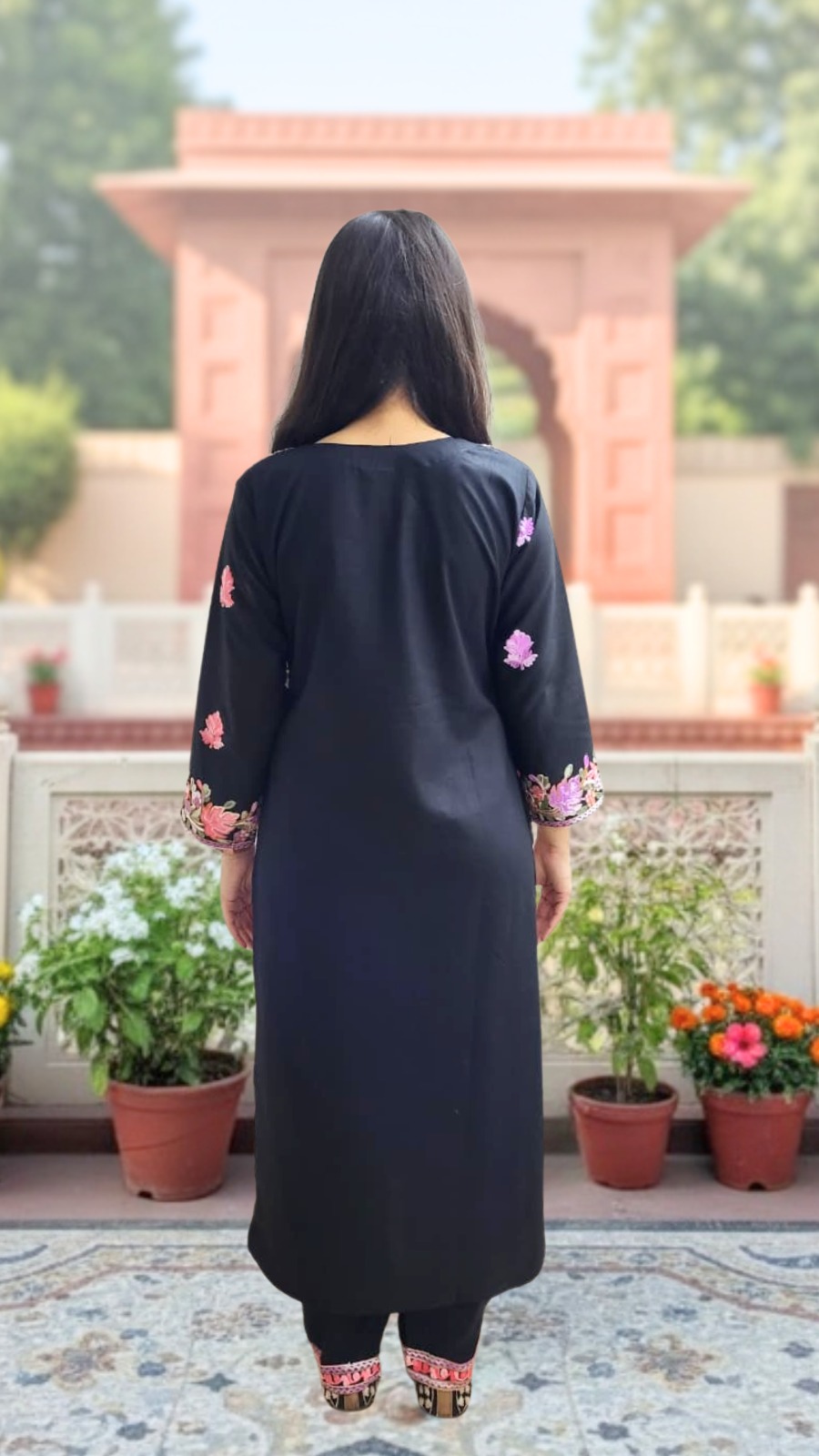 Make a bold and elegant statement with our Noir Bloom Embroidered Suit Set — a perfect fusion of sophistication and timeless style. Crafted in a luxurious black base, this ensemble is adorned with pink and purple floral embroidery, adding a touch of femininity and grace.