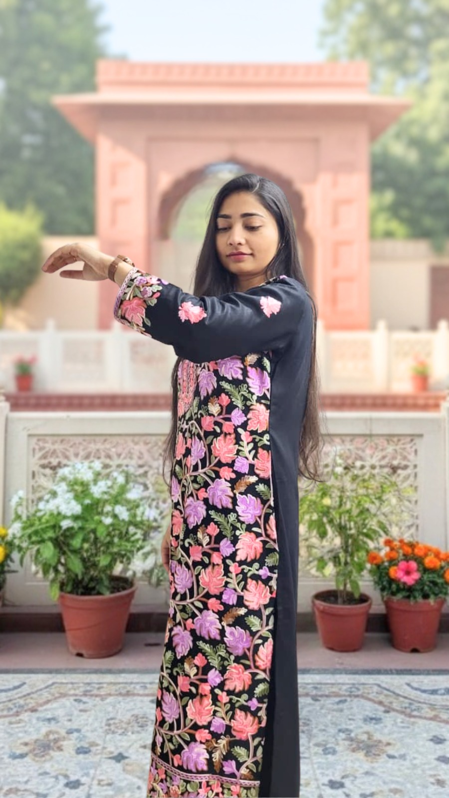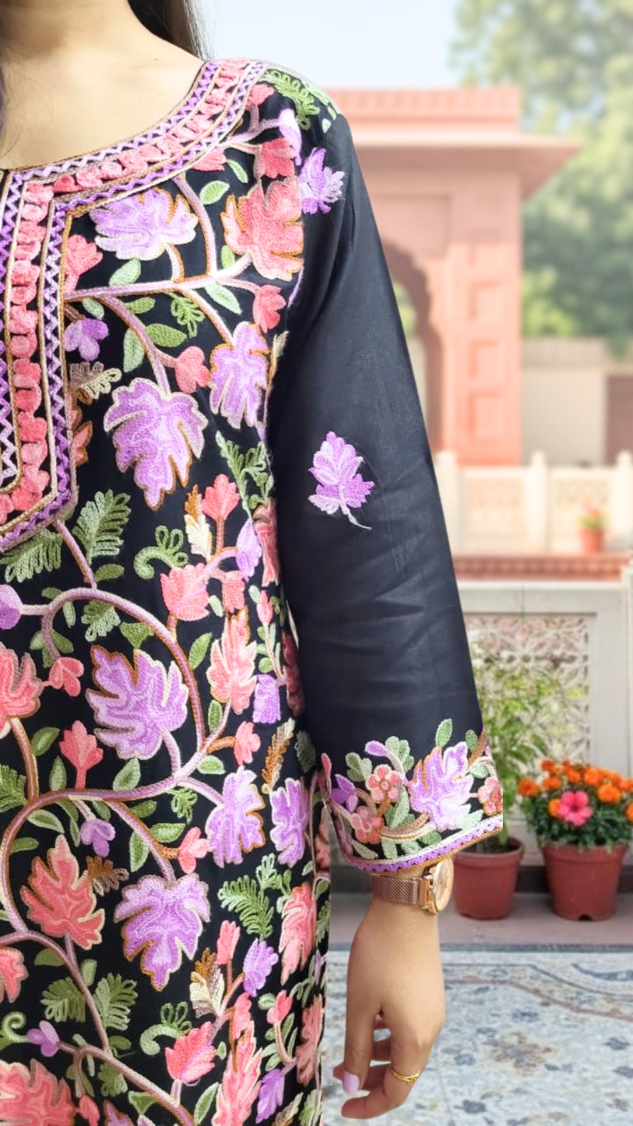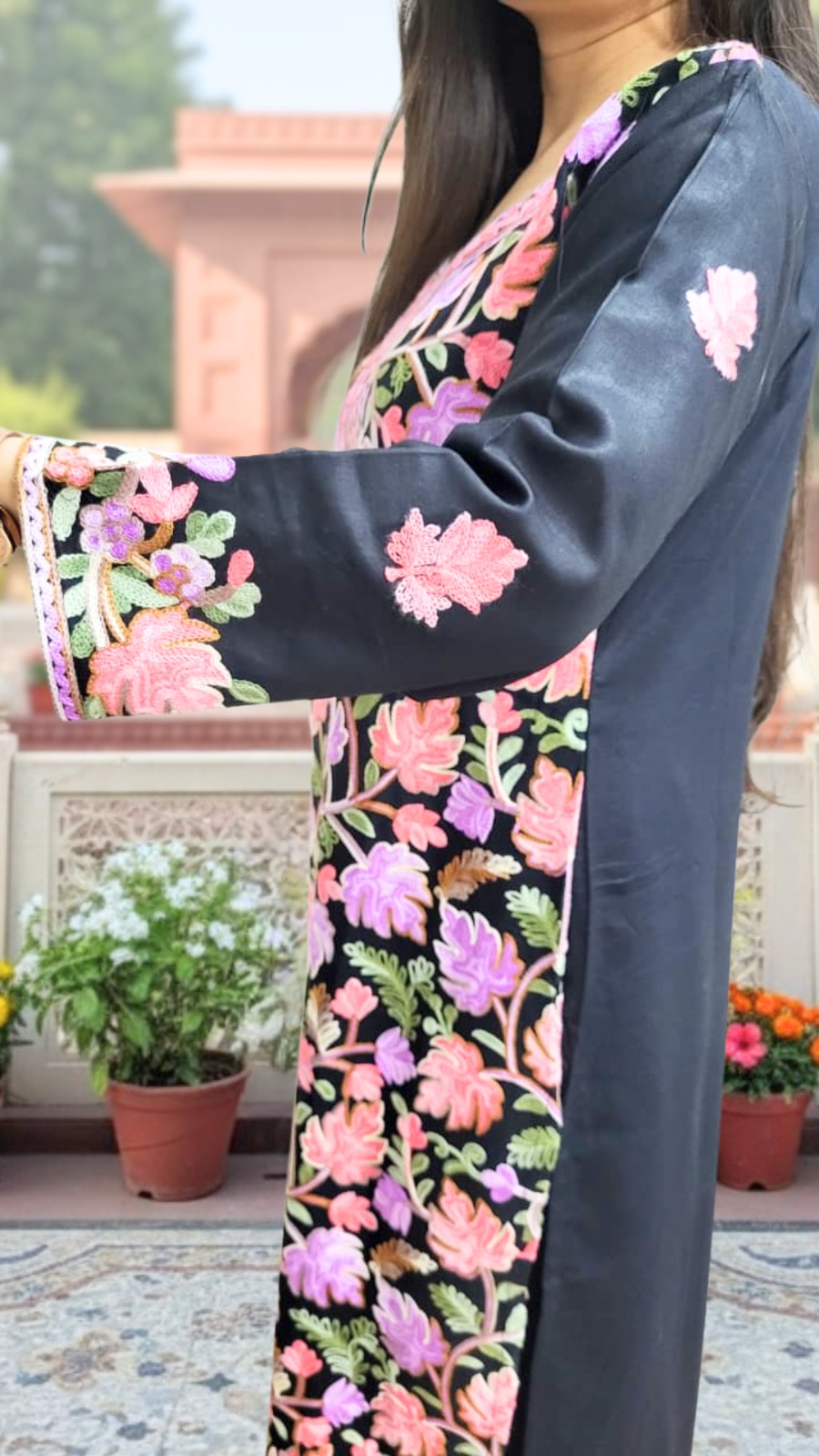 Design: Detailed thread embroidery that beautifully contrasts the rich black fabric